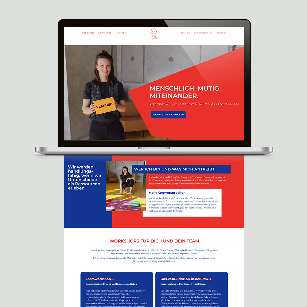 Die Website zeigt auf den ersten Blick, wofür Teamflow steht: menschlich, mutig, miteinander. Haltung und Arbeitsweise werden klar kommuniziert – ohne Buzzwords.